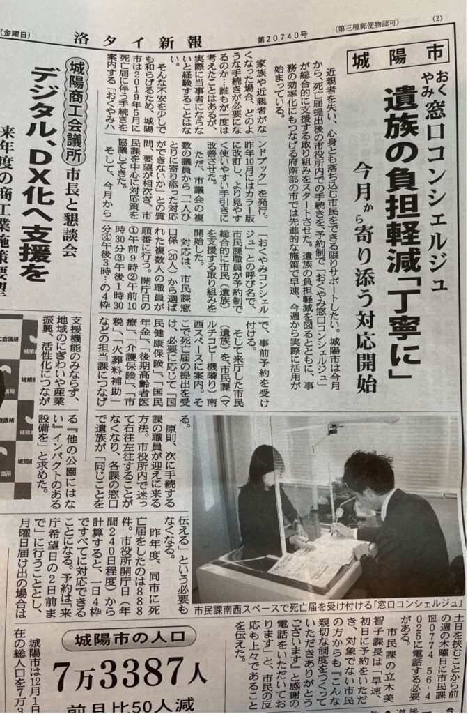 市民と接する窓口業務の改善の中で、寄り添う姿勢をかたちに。松坂市、別府市へ赴き先進事例からデータ等を頂き、議会にて導入を提案し、実現。 「おくやみコンシェルジュ」との呼び名で市民課職員が予約制で多種に渡る手続き、各課を総合的に付き添い支援する制度。